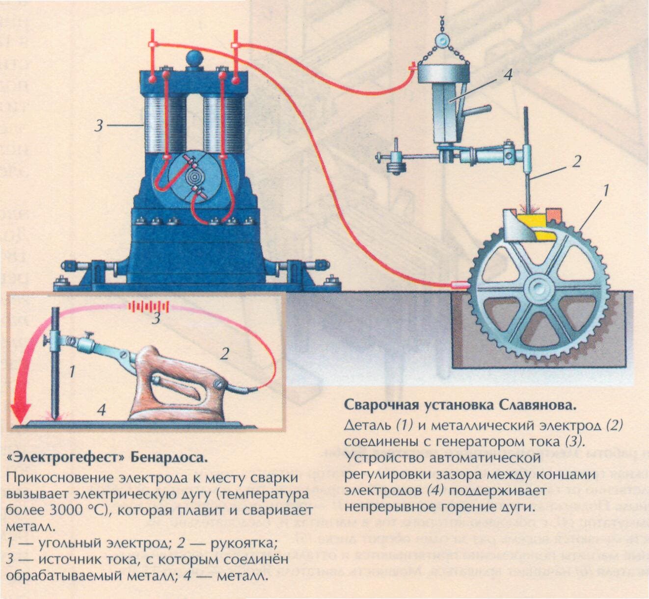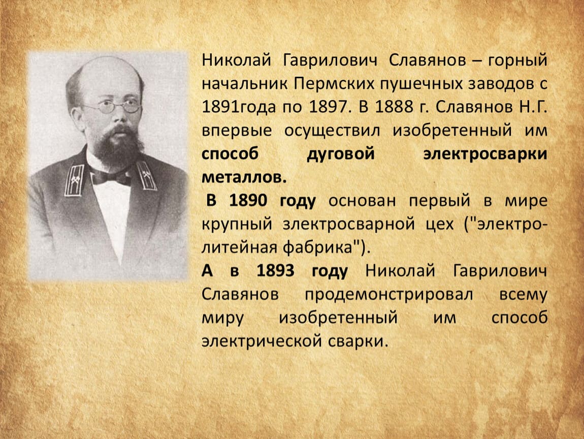 Славянов не только усовершенствовал методы дуговой сварки, но и внедрил использование плавящихся металлических электродов и флюса. Он создал первый сварочный генератор и автоматический регулятор длины сварочной дуги, что значительно повысило эффективность сварочных работ. Славянов также активно обучал рабочих, что способствовало профессионализации сварочного дела.
