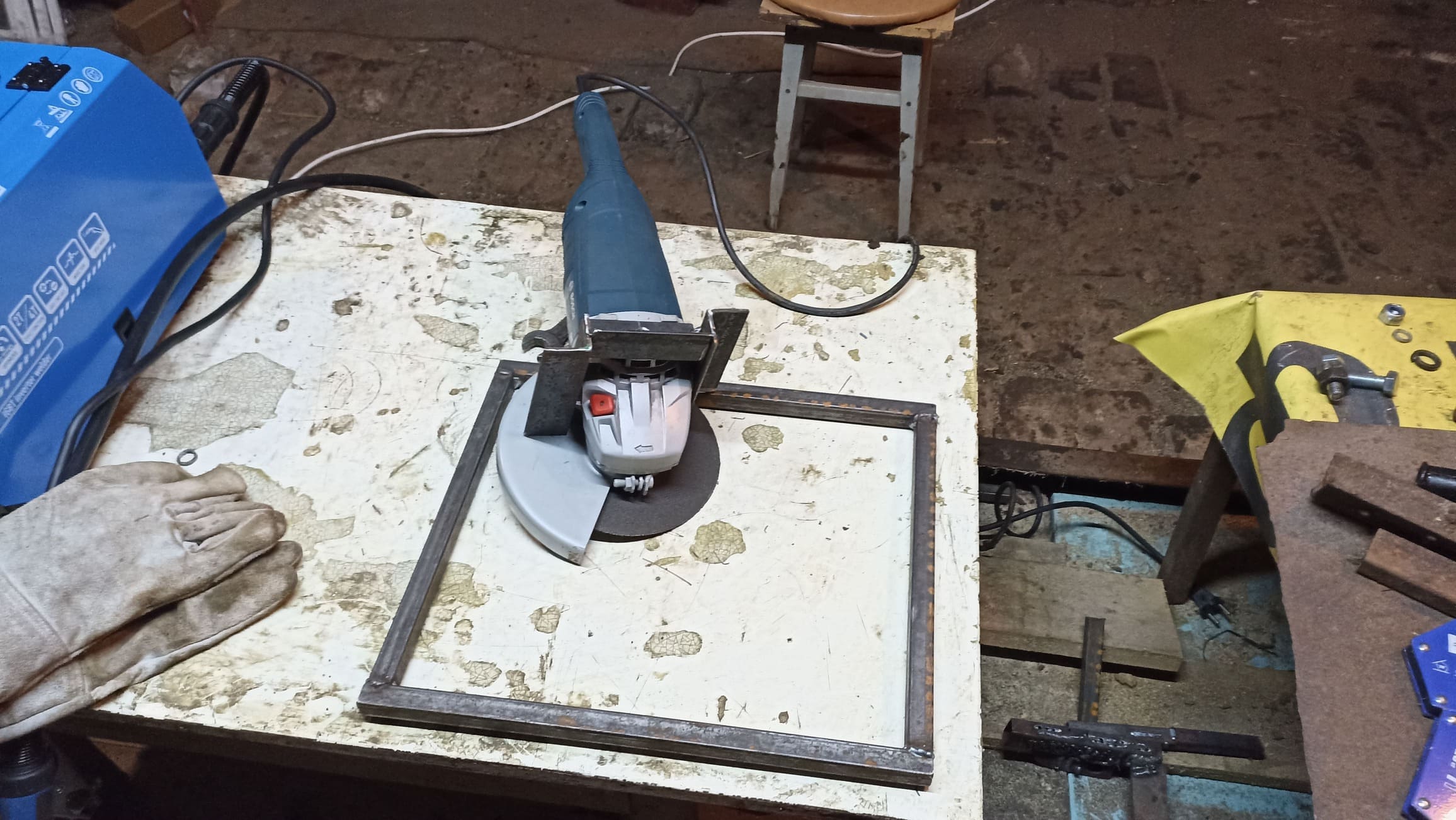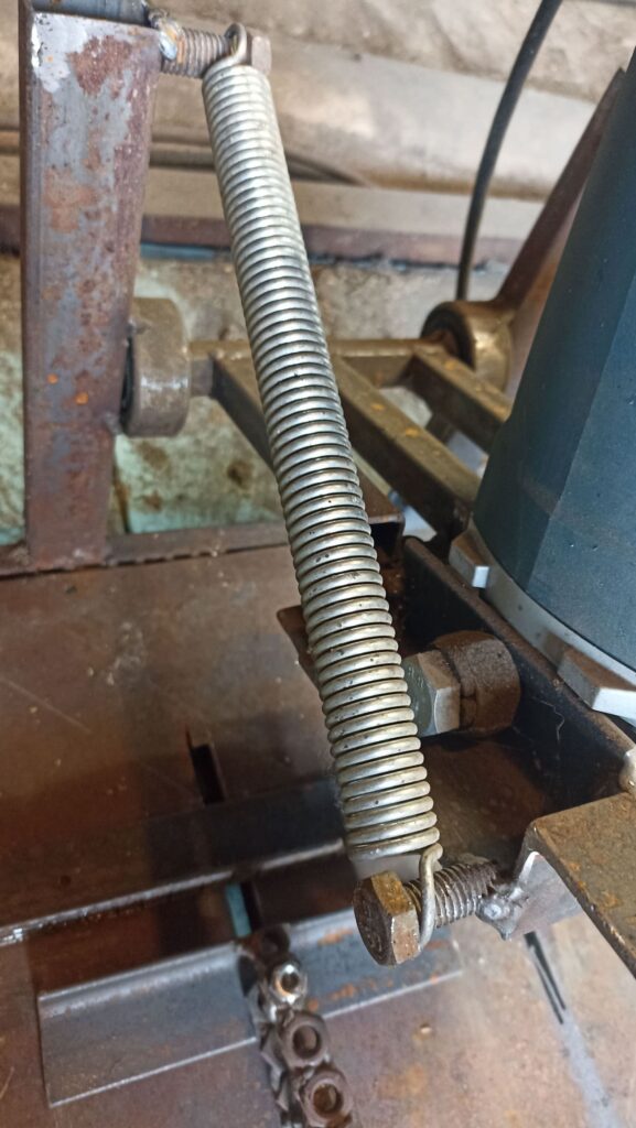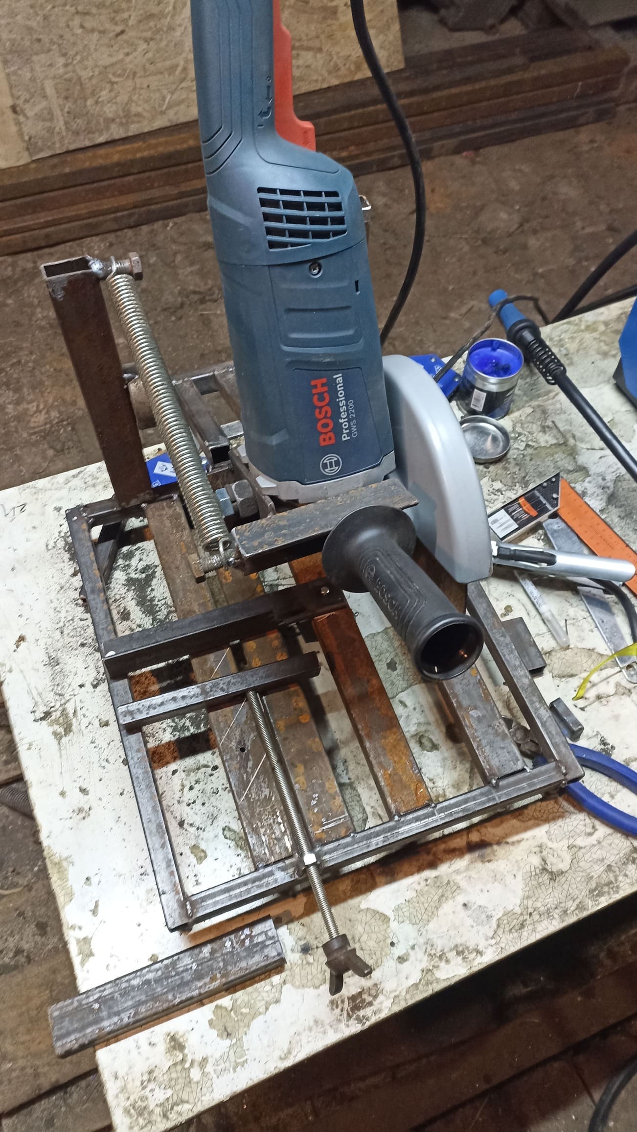 Установил возвратную пружину, которая поднимает УШМ после реза. Приварил дополнительные усиливающие элементы, выставил регулируемые ножки и проверил работу; при необходимости добавил подкосы для жёсткости.