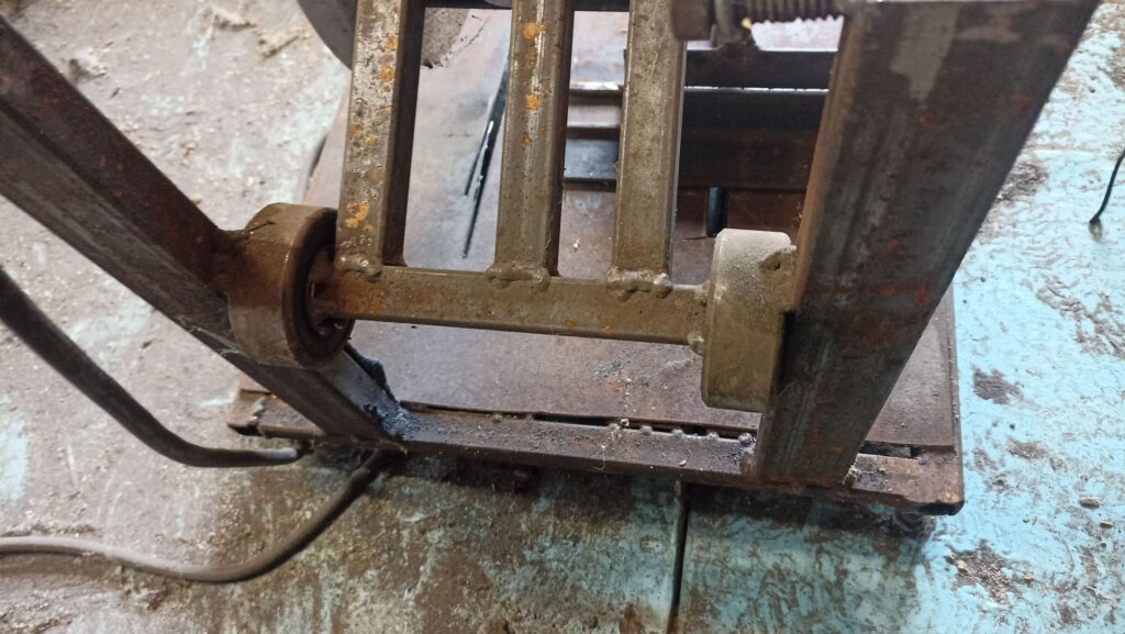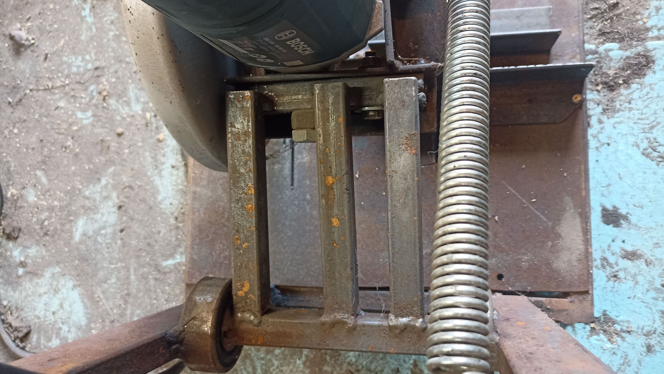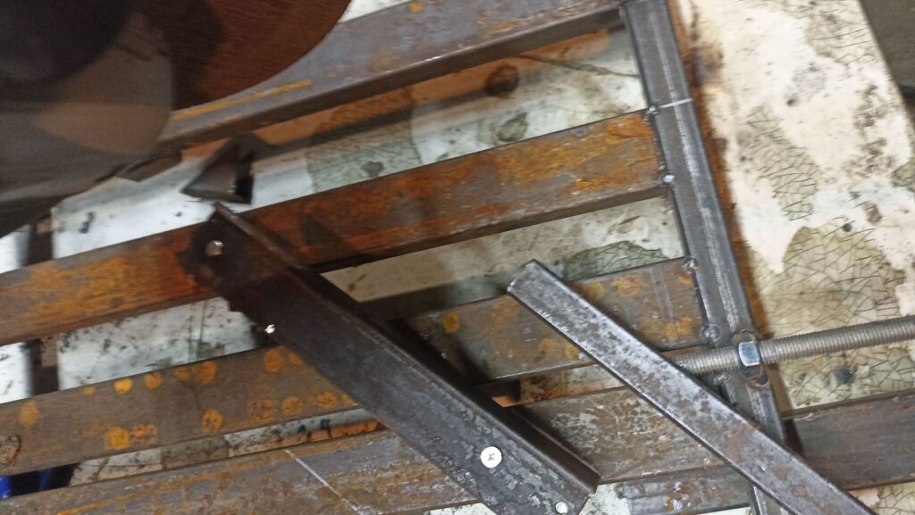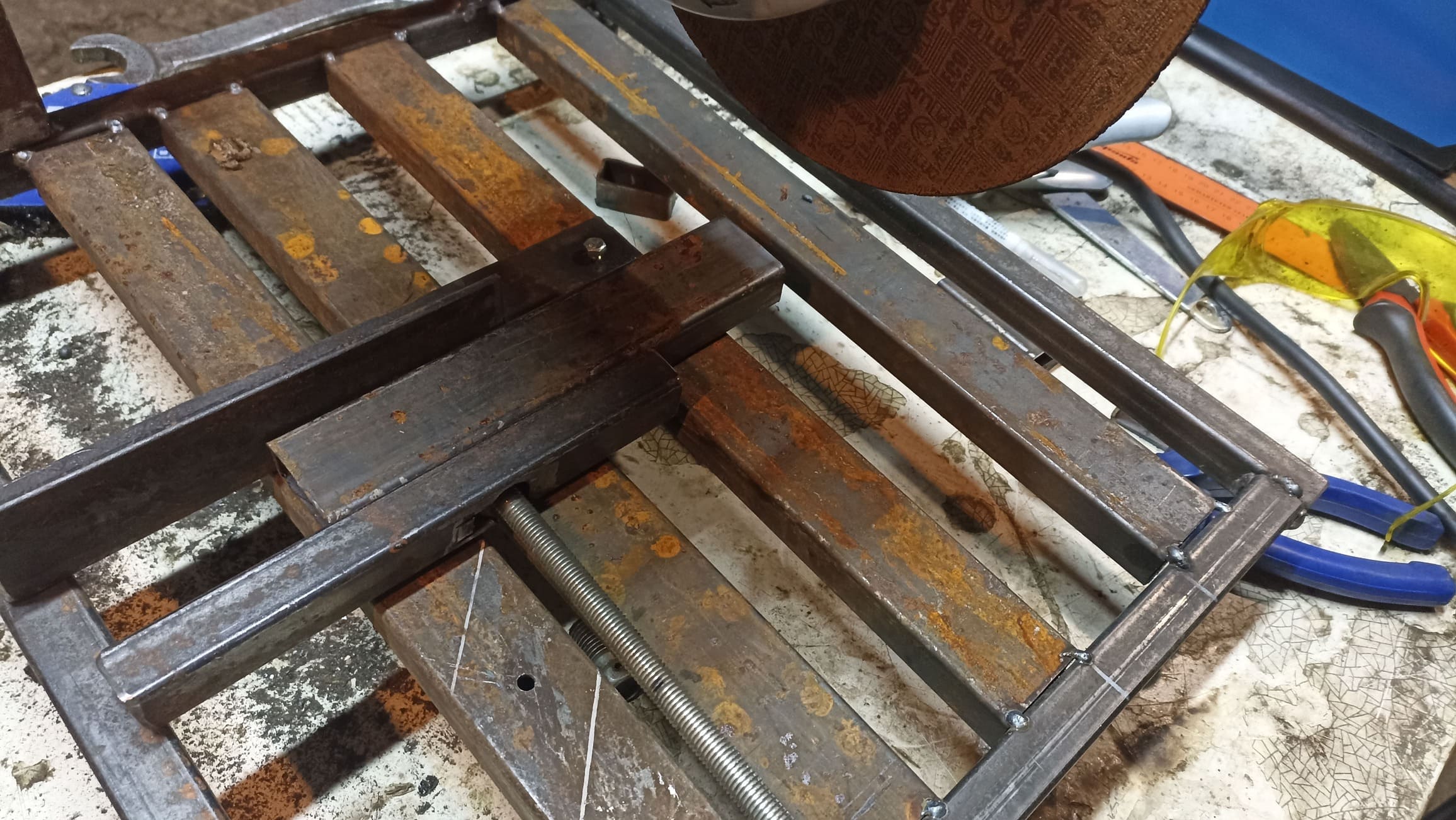 Установил возвратную пружину, которая поднимает УШМ после реза. Приварил дополнительные усиливающие элементы, выставил регулируемые ножки и проверил работу; при необходимости добавил подкосы для жёсткости.