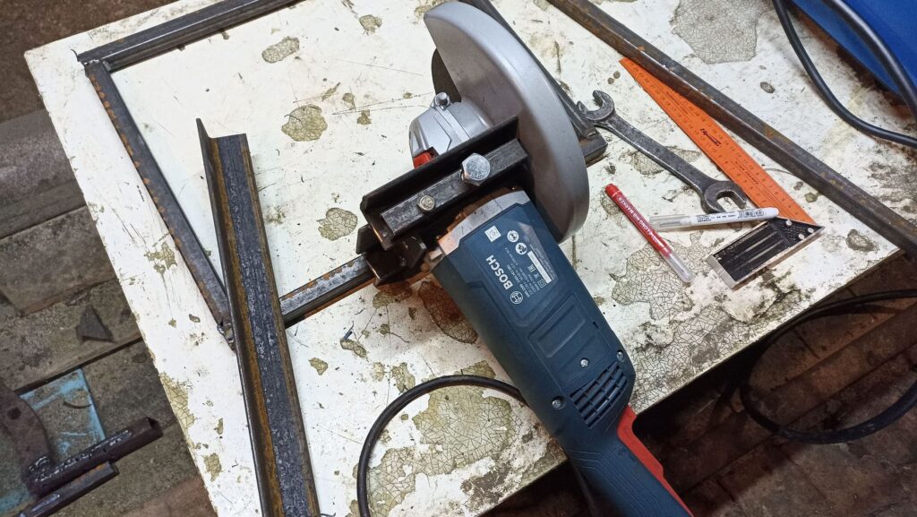 Рама выполнена из профильной трубы 20×20 и 40×20. В боковых рамках установлены подшипники, которые служат шарниром для подъёма/опускания корпуса УШМ. Болгарка крепится в посадочные отверстия ручек — через штатные места, фиксируется болтами. Прижим выполнен из уголка и шпильки, он поворотный — для резки под 90° и 45° (аналог поворотных тисков). Есть возвратная пружина, которая поднимает болгарку в исходное положение после реза. Ножки — регулируемые, чтобы выставить станину строго по уровню. На упоре сделаны насечки для лучшего сцепления заготовки.