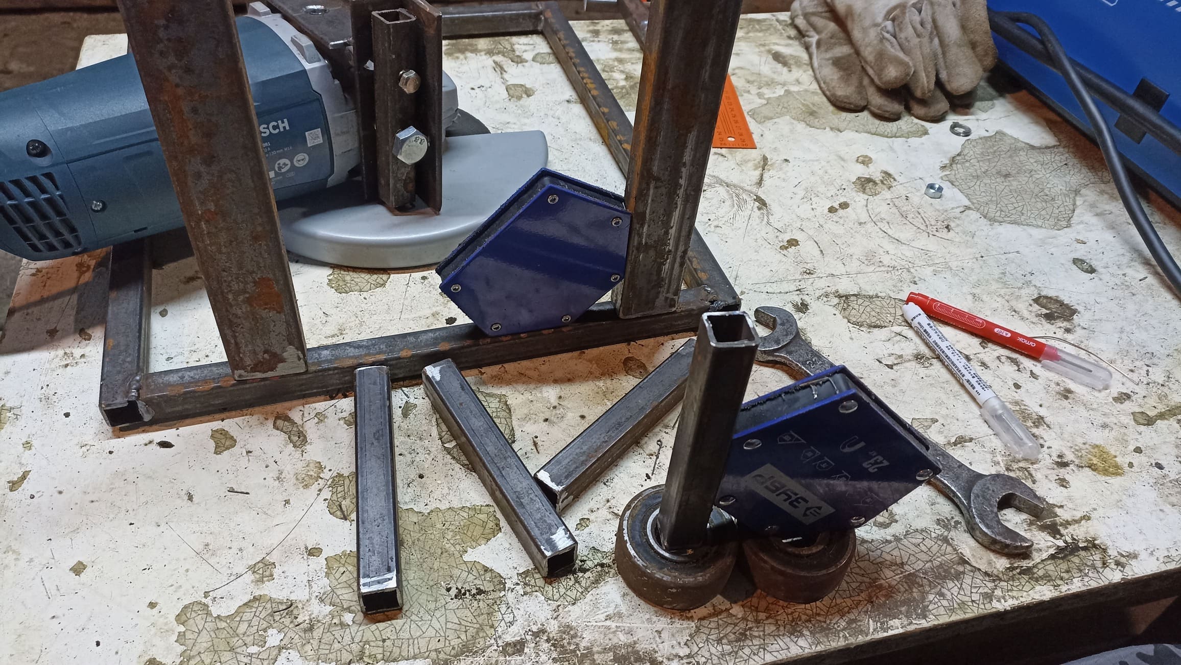 Резать трубы «на весу» — неудобно и нервно. Я собрал простую самодельную станину, чтобы ускорить процесс, повысить точность и снизить риск травм. Можно, конечно, купить фабричную станину, но самодельный вариант оказался дешевле и дал опыт конструирования — плюс лёгкая настройка под мою УШМ (Bosch GWS 2200, хотя подойдёт и любая другая 230-мм модель).
