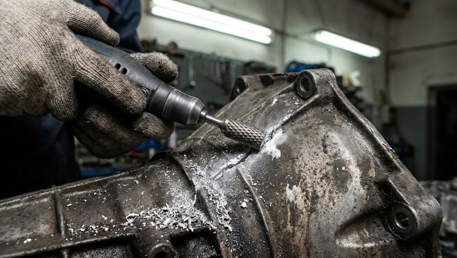 Шаг 1. Механическая зачистка. Абразивные круги (шкурка) плохи тем, что втирают грязь и оксид в мягкий металл. Лучший инструмент — твердосплавная борфреза по алюминию (с редким зубом) или шабер. Снимайте слой металла до чистого матового блеска.