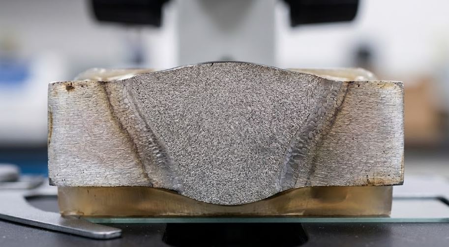Макроснимок поперечного среза (шлифа) сварного шва, выполненного АНО-4, демонстрирующий его плотную структуру.