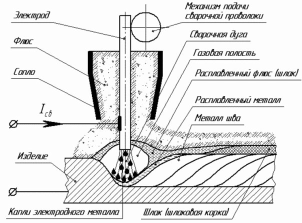 - «Погружение» дуги: Дуга моментально оказывается полностью скрытой под слоем флюса. Мы не видим ее яркого света, что значительно улучшает условия труда оператора – не нужен даже традиционный сварочный щиток!